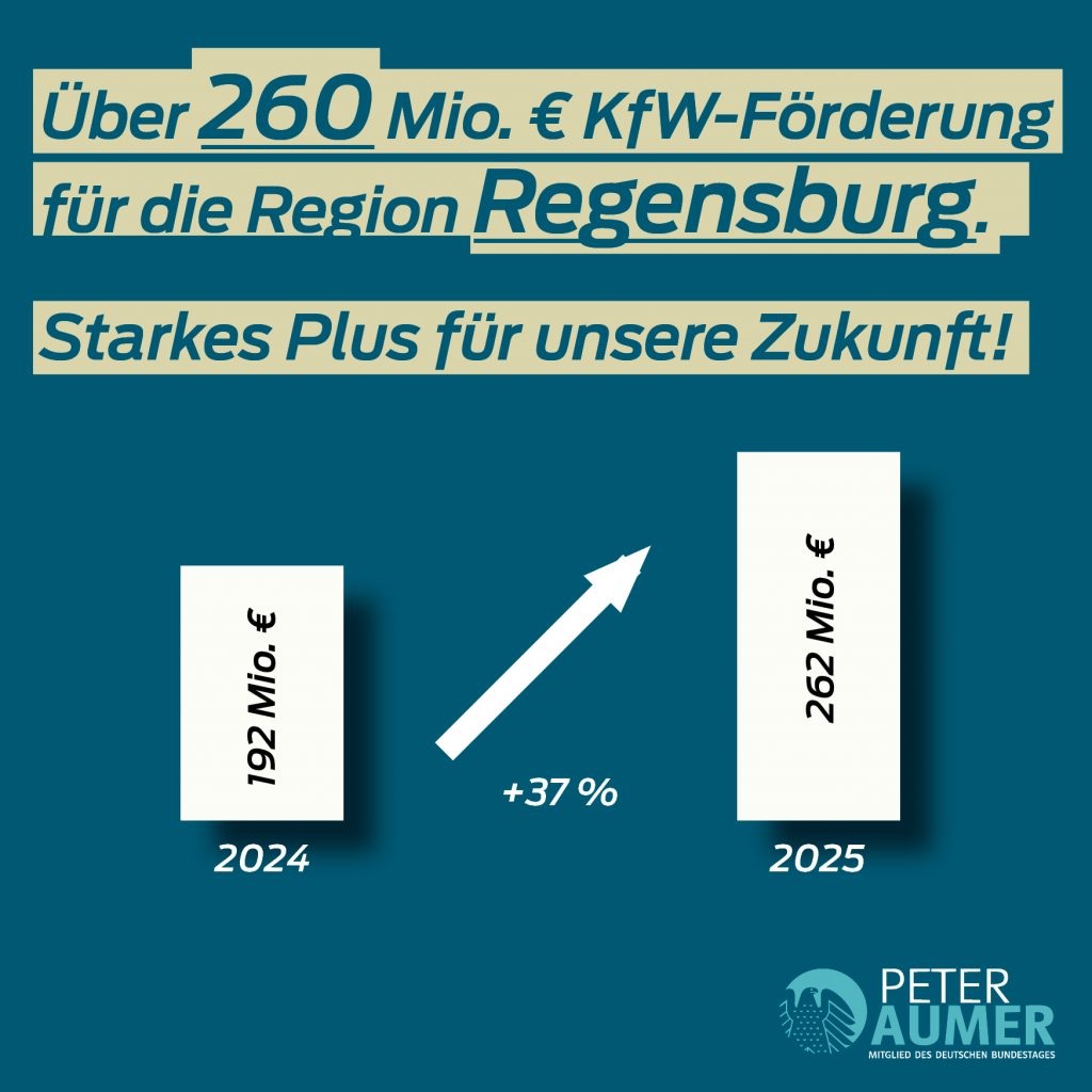 Gute Nachrichten für Stadt und Landkreis Regensburg: Die KfW-Förderung ist 2025 unter der neuen Bundesregierung um 37 % gestiegen – von 192 Mio. € auf über 260 Mio. €. Investitionen in Digitalisierung, Energieeffizienz, Wohnen sowie Gründungen und Unternehmen stärken unsere Region nachhaltig.